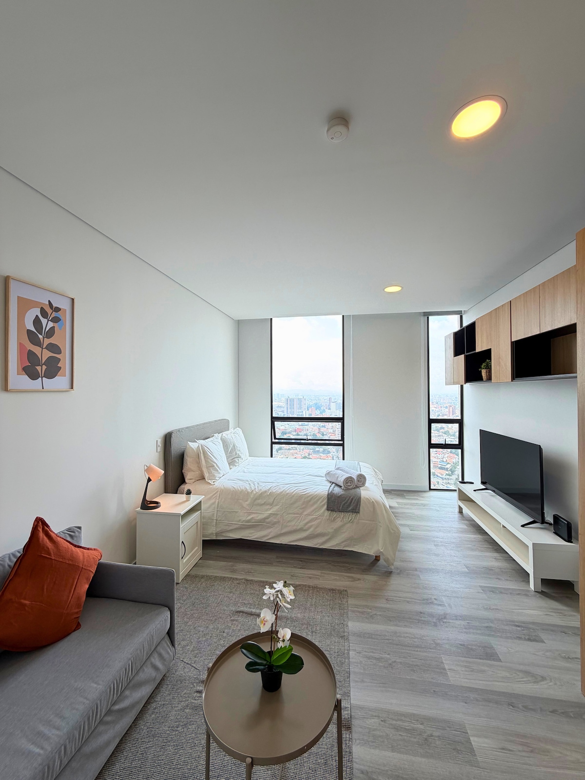 Encantadora suite en el corazón de Bgtá, ideal para parejas o viajeros. Decoración elegante, cocina equipada y cómoda cama doble. Balcón privado con vistas impresionantes, Zonas Sociales como Area de Lavado, gym, mesa de billar y ping-pong, CoWo, terraza BBQ en el último piso con vista de 360° y seguridad 24 hrs. Cerca de mercados, museos, restaurantes en La Macarena, Monserrate, La Candelaria, Mall San Martín y el Centro Internacional. ¡Descubre lo mejor de Bogotá desde esta maravillosa Suit!