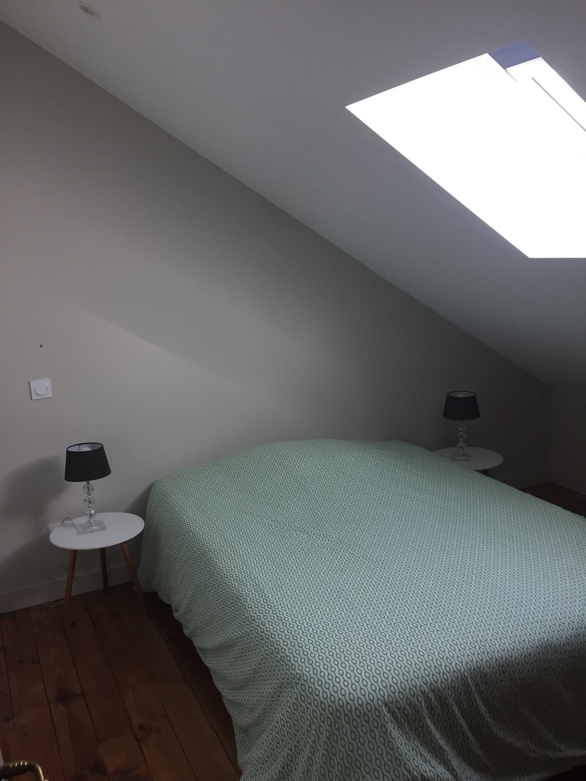 Chambre mansardée au deuxième étage d'une maison de ville avec salon TV privé, salle d'eau et toilettes privées. Petit déjeuner compris. Accès piscine. Quartier calme. Idéalement située à 8 minutes à pied du centre ville. Stationnement facile et gratuit.