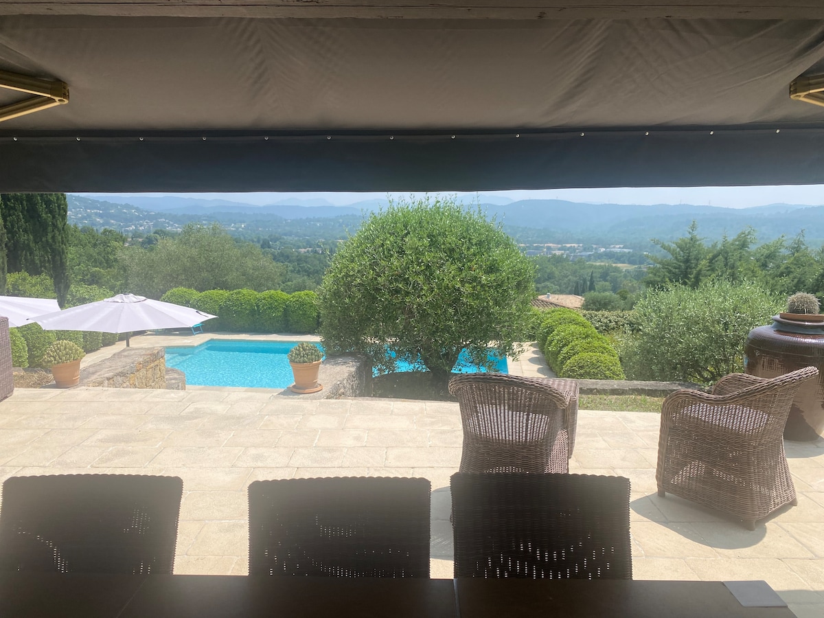 situe en bordure d’un espace boisé naturel 2 hectares avec une vue Exceptionnelle à 360°(ENTIEREMENT RENOVEE en FEVRIER travertin au sol et salles de bains refaites ) Orientée plein sud, sans vis-à-vis, proche de tout : terrasse, salon climatisé, cuisine équipée, 4 chambres (3 climatisées), 1 sde 2 autres salles d eau une belle piscine de 12x5 sur joli terrain de 3000m2. Location longue durée uniquement de septembre à fin janvier charges électricité et eau à la charge des voyageurs .