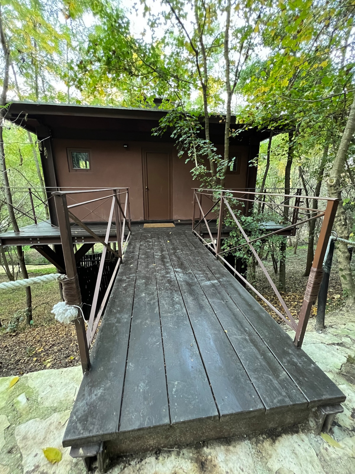 Our treehouse in the woods, built from iron and originally used as a bivouac, has been transformed into a retreat inspired by Japanese philosophy. Inside, it offers a unique experience with an ofuro (traditional Japanese bathtub), a sauna for relaxation, and an emotional shower that stimulates the senses. The minimalist design and attention to detail create a serene atmosphere, perfect for rejuvenating in harmony with the surrounding nature.