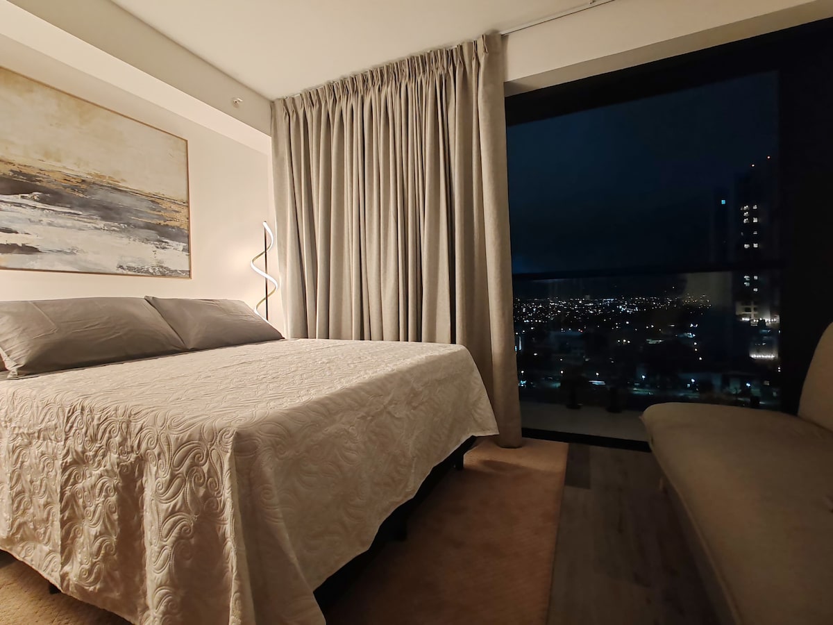 Lets chat for a FREE early check in 24/7 security, ONLY building to park a PICK-UP Get up in the morning to the most magnificent view of Irazú Volcano, enjoying a cup of the most amazing costarican gourmet coffee. Get on to the amenities to enjoy a relaxing session in the Sauna or Hot Tub, put in a day of work then go out for a 2 minute walk to a delicious restaurant finally back home a comfy queen bed will welcome you. Tons of public transport available including a small train station.
