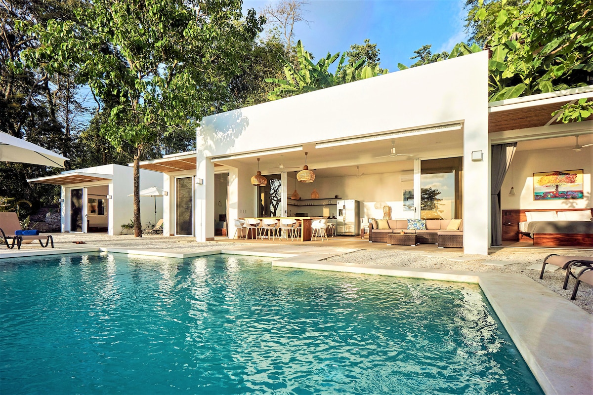 Esta villa de estilo moderno de nueva construcción es un lugar perfecto para relajarse y disfrutar de las impresionantes vistas al océano y a la costa. Este moderno diseño abierto con puertas plegables totalmente abiertas te permitirá disfrutar plenamente del paraíso, pero con la comodidad de tu hogar. Nuestra villa se encuentra en la cima de la montaña y solo con acceso privado cerrado. Nuestros cuidadores de la propiedad viven en la propiedad para garantizar que nuestros huéspedes reciban el mejor servicio y seguridad y estén disponibles si es necesario en cualquier momento. ¡Te damos la bienvenida al paraíso!