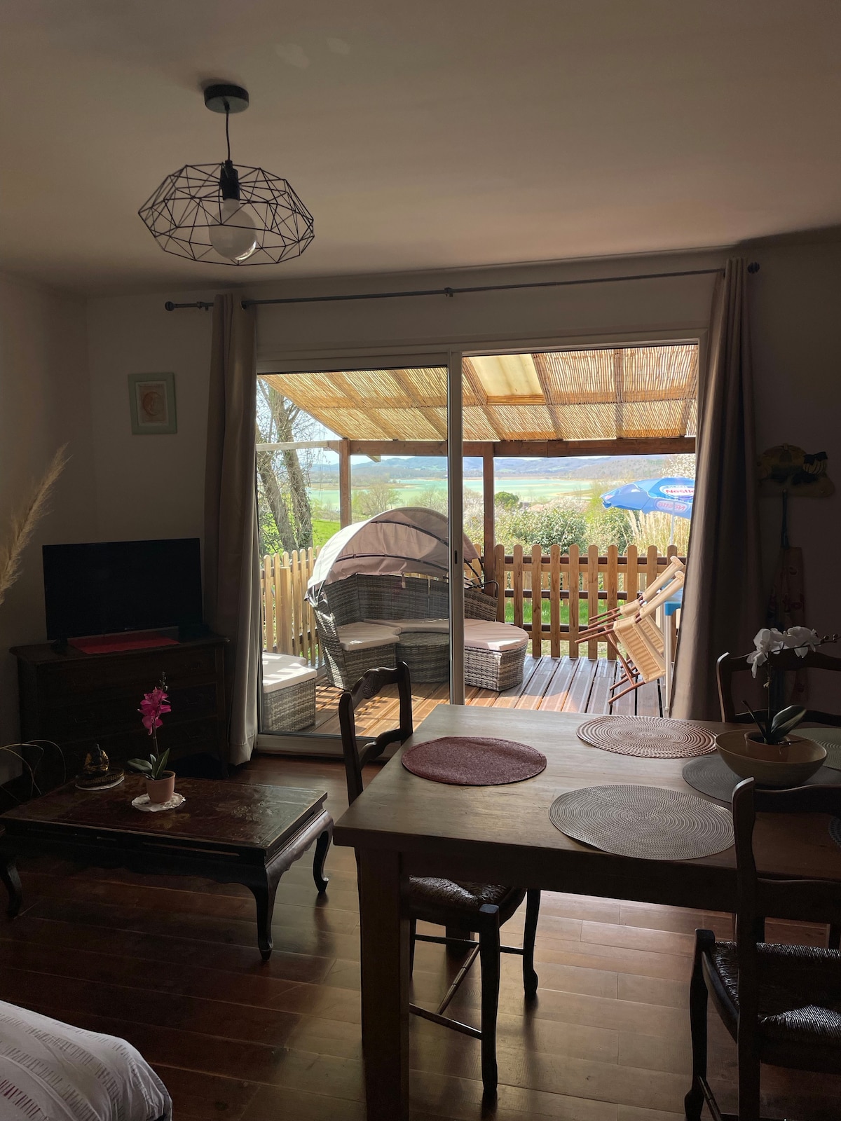 Casa muy tranquila frente al río y al pie de la montaña. Tiene un hermoso salón rústico con estufa de leña, vigas y piedras a la vista. La cocina está abierta al salón y está totalmente equipada. También hay una gran terraza cubierta muy agradable con vistas a los acantilados de Sinsat y al valle. El jardín con su campo de petanca es privado y cerrado. Además, tendrá la opción de aparcar allí.