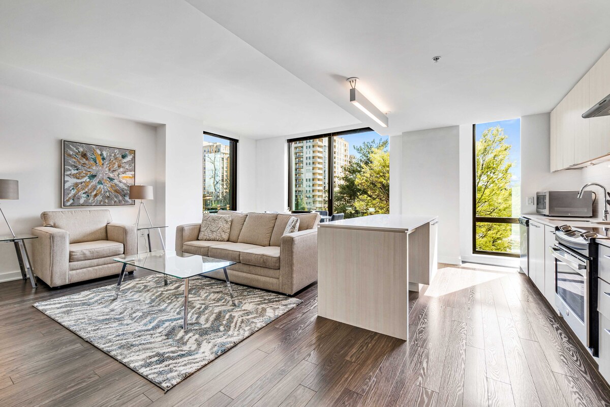 In the heart of Bethesda’s walkable Downtown neighborhood, this new high-rise offers luxurious amenities and a sunny, modern living space. It’s perfect for business or leisure stays. Highlights include: • Gorgeous chef’s kitchen with stainless steel appliances and stone countertops • Outdoor jetted pool and sun deck with BBQ grill stations, reminiscent of a luxury resort • Ideal location within walking distance of the Bethesda Metro Station (Red Line) and quick access to I-270 and the Beltway