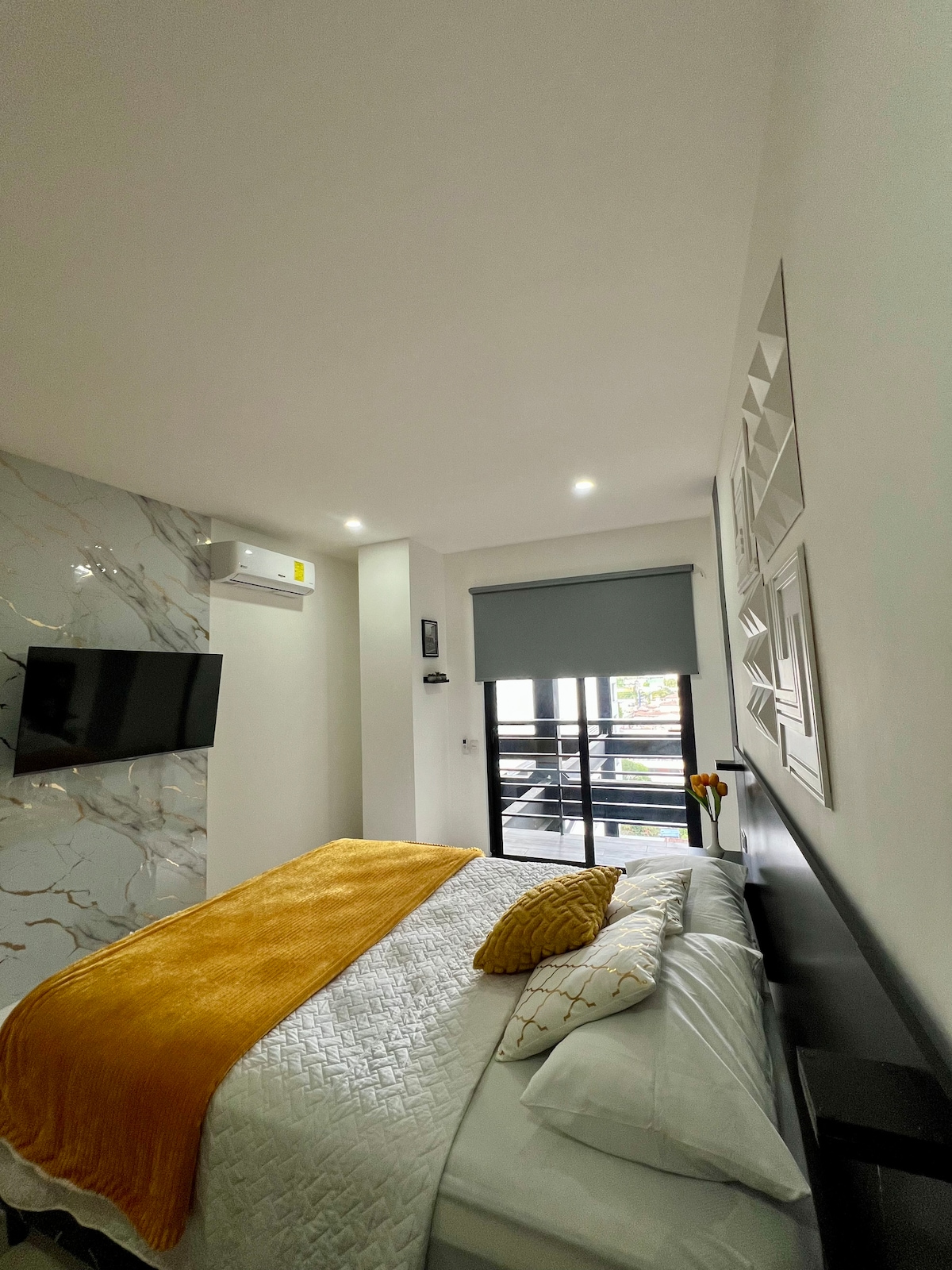 Moderno Apartamento, acceso a mini gimnasio y Work Cube, ubicado en zona residencial segura, a 45 minutos del aeropuerto, 15 minutos de los principales centros comerciales. A sus alrededores fácil acceso a supermercados, farmacias, Estadio Cuscatlán, servicios de bus, restaurantes, etc. Ubicado en el cuarto nivel, cuenta con A/C, Smart TV 55 pulgadas, Wifi 50 mg, cocina, baño privado, pequeño espacio de escritorio, área de lavado, 1 parqueo privado y entrada con control remoto.