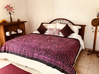 Esta encantadora habitación está construida en adobe, lo que le otorga un toque rústico y acogedor. El piso de barro, combinado con los detalles de mosaico de talavera en el baño, crea una atmósfera cálida y auténtica. Los roperos de madera apolillada añaden un aire vintage y lleno de carácter, mientras que las cenefas pintadas a mano adornan las paredes, reflejando la tradición y el arte local. Un espacio perfecto para quienes buscan una experiencia única y genuina.