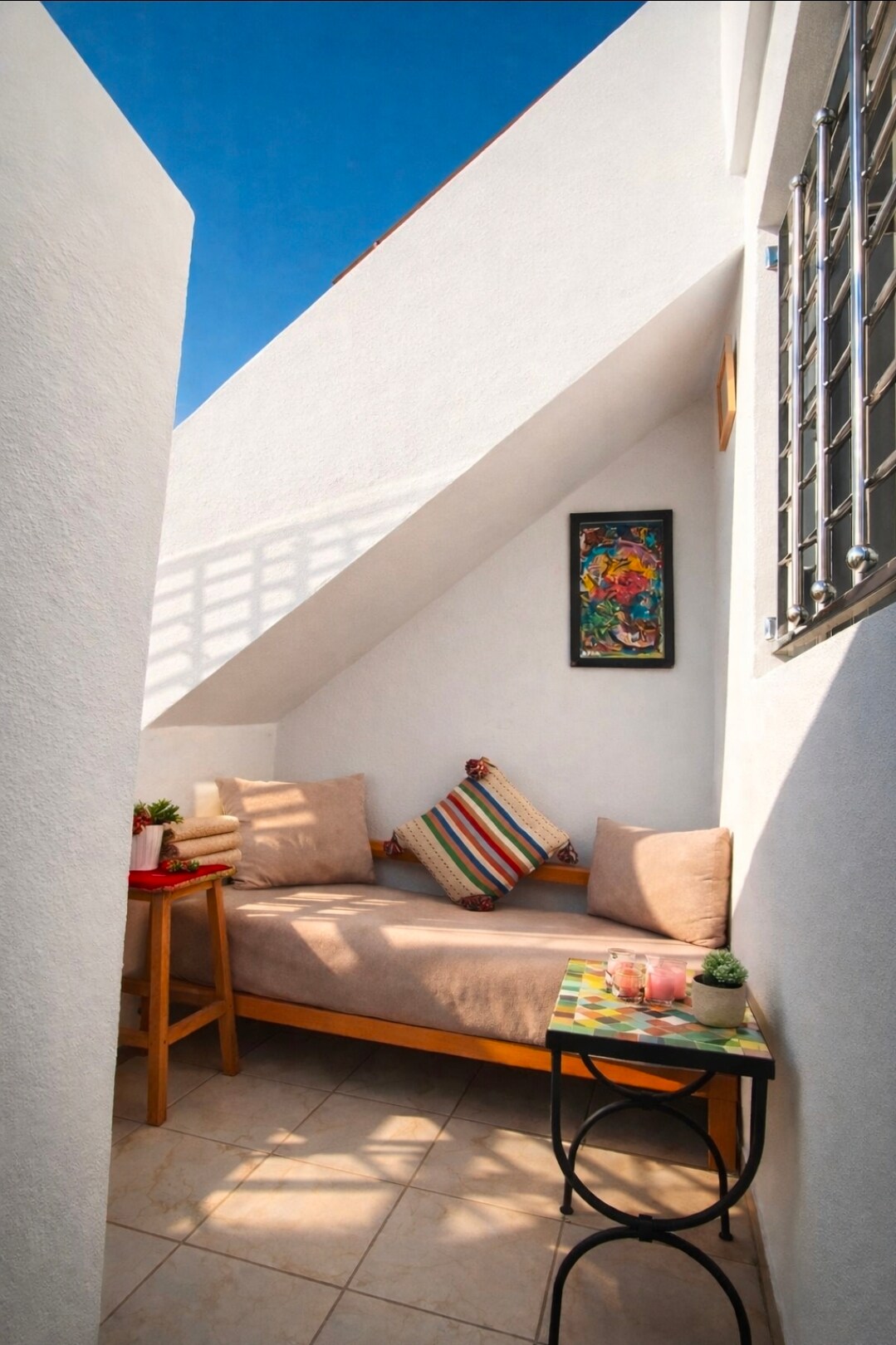 Bienvenue chez moi à Essaouira - la ville du vent et de la lumière ! Situé au cœur de la vie locale, vous découvrirez le quotidien des habitants, boulangerie, petite échoppes, marchands de fruits et légumes, et artisans. Au pied de l’immeuble, le Café Littéraire d’Essaouira, un lieu chaleureux et culturel. À deux pas de la Médina, profitez du rythme de la ville puis retrouvez le calme et le confort pour vous détendre.