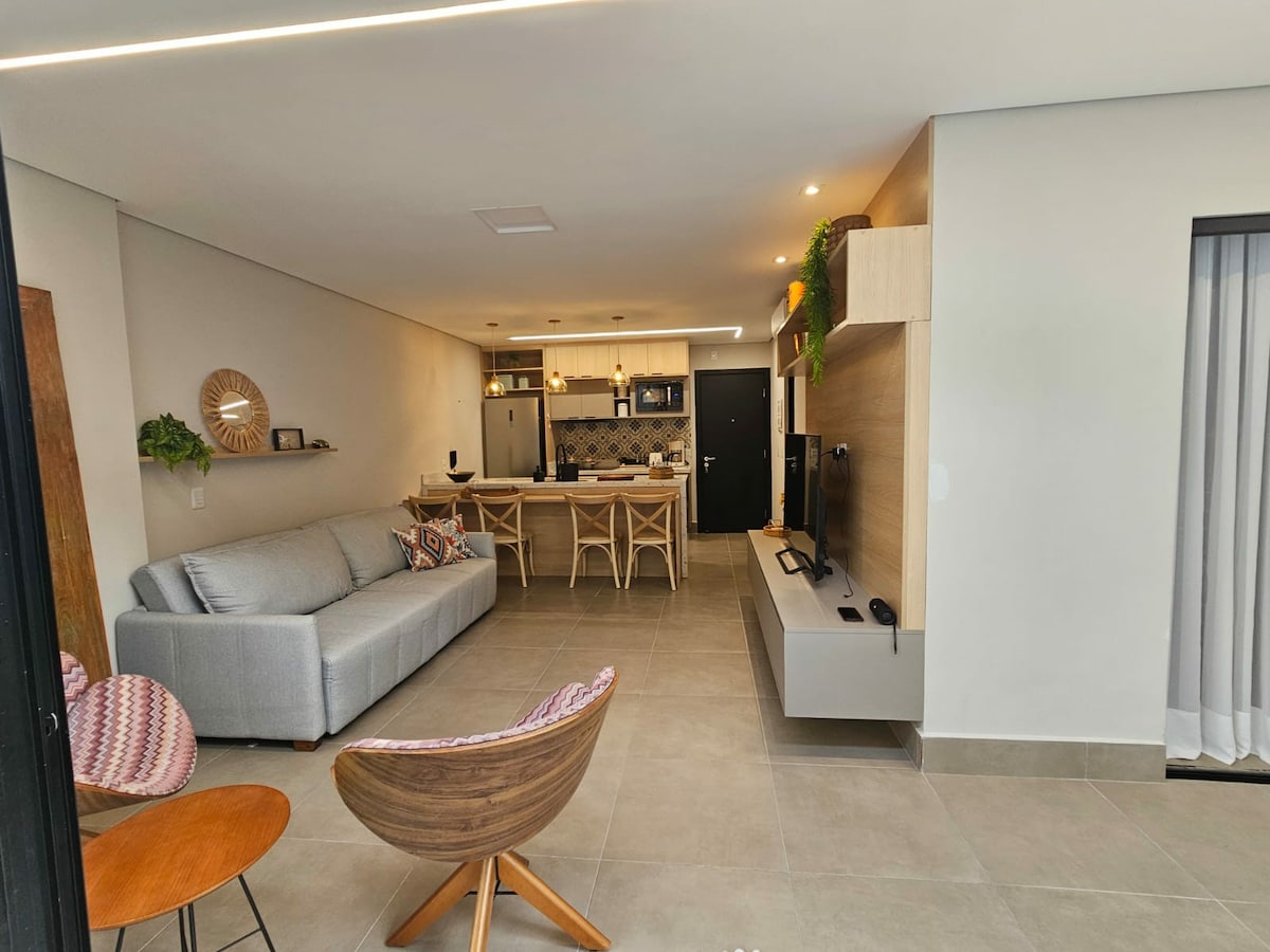 Increíble apartamento en un edificio nuevo, con una decoración sofisticada y funcional. Nuestra casa en invierno que ofrecemos a los huéspedes en verano. Aire acondicionado split. Wifi de 240 Mb. TV de 60" en la sala de estar y de 35" en las habitaciones. Cocina, horno eléctrico, microondas. Nevera y congelador. Cocina y despensa totalmente equipadas. Lavavajillas, lavadora/secadora. 1 suite con cama Queen y un dormitorio con baño y dos camas box. Balcón gourmet cerrado con vidrio, con parrilla y nevera extra para bebidas.