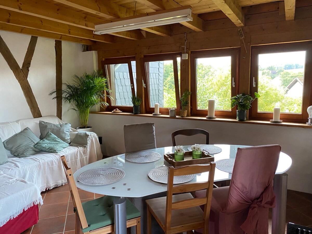 Gemütliche Dachgeschosswohnung mit eigener Sauna und großer Loggia in Waldrand- und Höhenlage. Wander- und MTB-Wege direkt vor der Haustüre. Ruppichteroth liegt in der waldreichen Hügellandschaft des bergischen Landes, nahe Siegburg / Bonn / Köln. Die idyllische Landschaft bietet zu jeder Jahreszeit einen Anreiz zum erholsamen Verweilen und vielfältige Möglichkeiten für sportliche Aktivitäten (Wandern, Radfahren, Reiten, Drachenfliegen, Kanu/Kajak auf Bröl und Sieg).