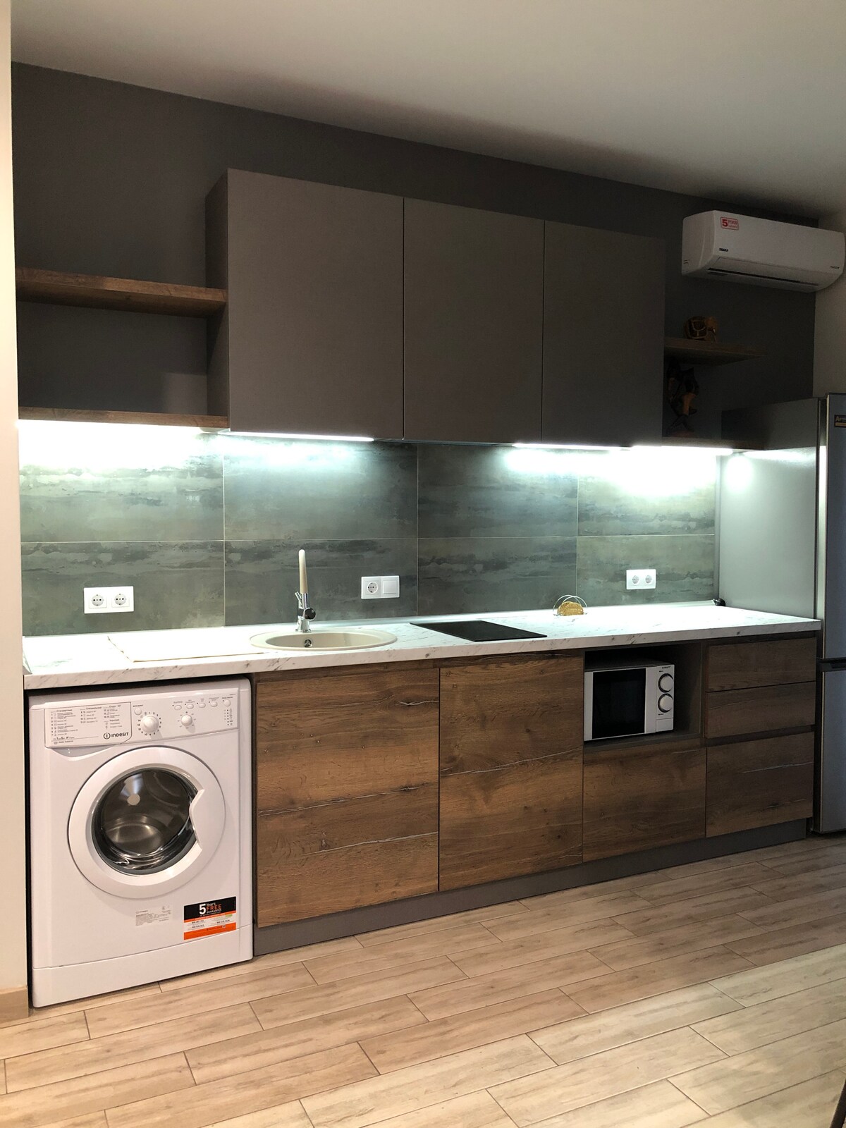Green studio apartment is situated in the heart of Dnipro city The apartment is on the last 9th floor and the size is about 35 m2 The ceiling height is more than 3 meters, that is why the apartment looks spacious. Soft comfortable bed, fully equipped kitchen including a washing machine and microwave. The brand new and latest QLED model of Samsung smart tv. The bathroom has a shower and separate toilet room