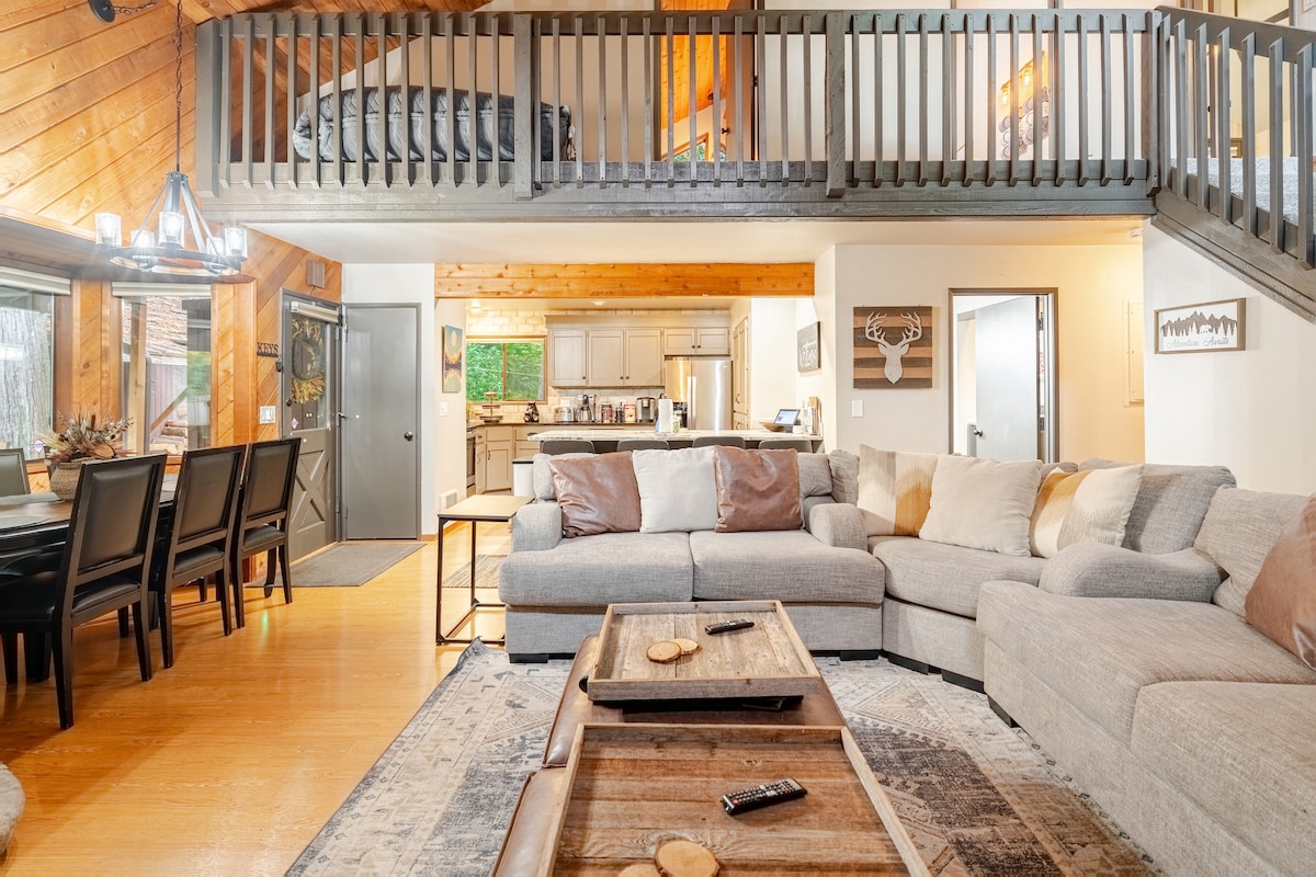 Immaculate mountain-themed lakeside chalet! Just over 1 hour from Portland but situated at 4,000 feet in a breathtaking alpine setting that feels like another world! Walking distance from pool, hot tubs, restaurants, bars, stores and trails. Air-conditioning in upstairs bedrooms. - 1st floor: garage / laundry room / rec room - 2nd floor: kitchen, dining room, living room, balcony overlooking lake - 3rd floor: 2 bedrooms with queen beds + separate sleeping area w/ queen beds above and below