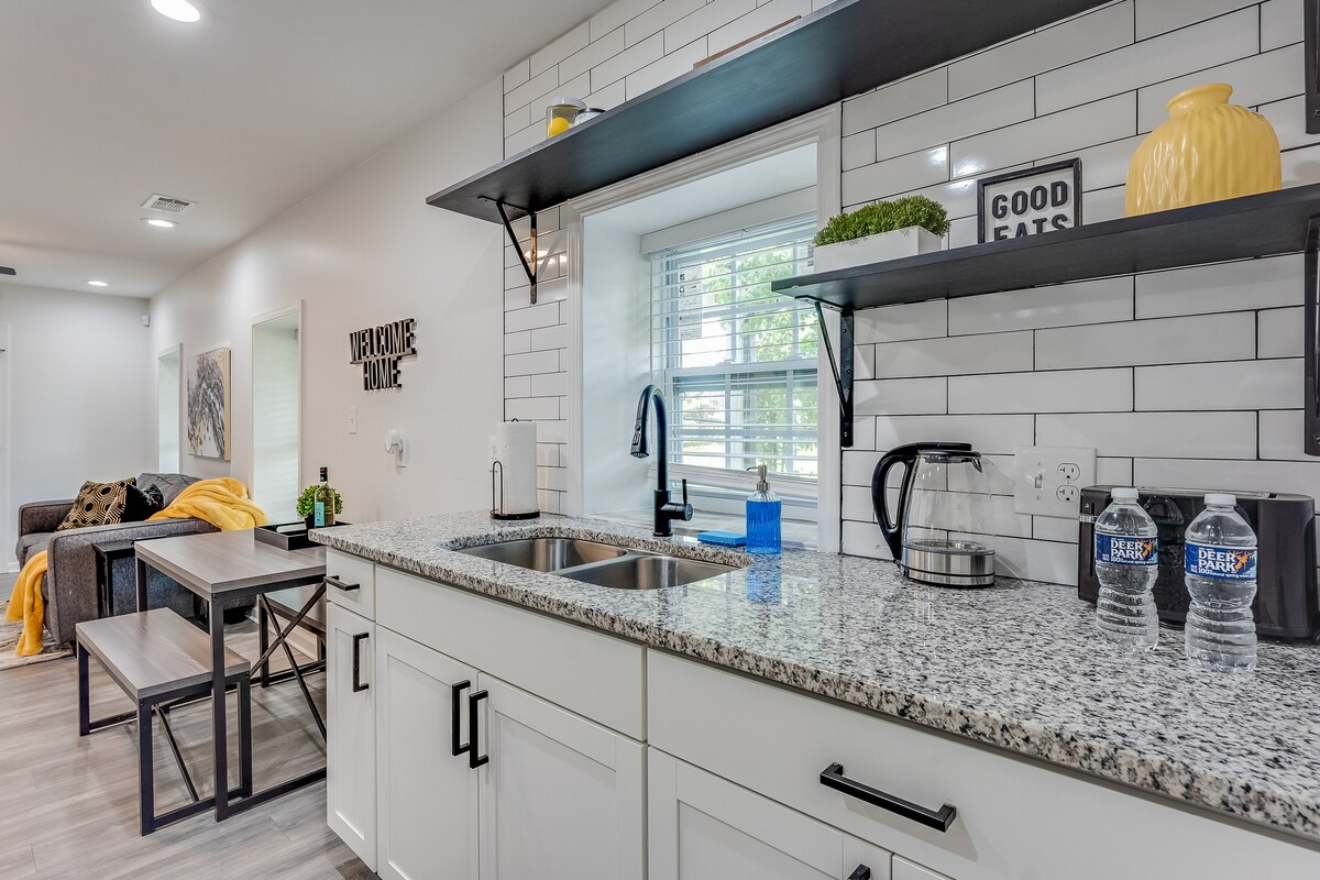 Elegante refugio en la casa trasera con acabados prémium. Amplio dormitorio con cama tamaño king y TV inteligente, además de sala de estar con su propio televisor. Cocina totalmente equipada con artículos básicos, utensilios de cocina, cafetera y freidora de aire. El baño tiene dos entradas para la privacidad. Las comodidades incluyen lavandería en la unidad, mesa de comedor para 6 personas para reuniones o trabajos remotos y estacionamiento en el garaje. La despensa incluye elementos básicos para que puedas instalarte de inmediato. ¡Tu tranquila escapada al centro con total privacidad!