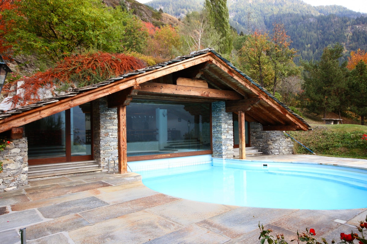 Montañas Alpes. Italia. Valle de Aosta. Una cabaña en un pequeño pueblo a 1600 metros,en la paz de prados, vacas de pastoreo y montañas. Nieve (por lo general) durante el invierno. Un lugar del corazón, restaurado con amor preservando las antiguas vigas del techo. Una vista maravillosa desde los grandes ventanales y una tranquilidad especial para aquellos en busca de paz, calidez y relajación. Los muebles son muy agradables: madera sobre todo, pero también colores más animados y comodidades modernas. Excursiones tranquilas, tanto en raquetas de nieve como en esquí.