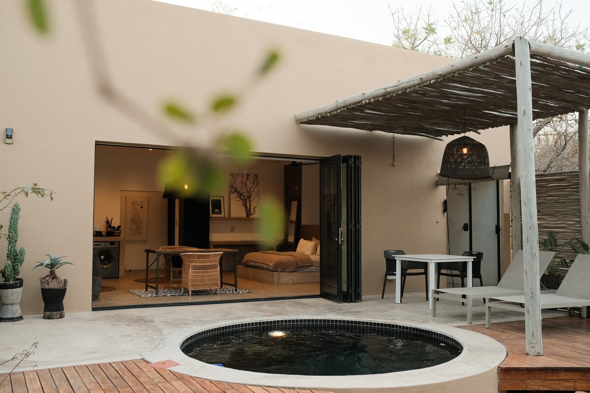 Completed in 2023, this little bush house is a very special open-plan, self catering space, set in a wildlife sanctuary approximately 14kms from the entrance to Kruger. It's a little bit of luxury with a 3mx3m 'deep enough to jump in' splash pool. Relax on the elevated patio surrounded by trees or sit inside with the huge sliding door open and watch the wild animals that visit - kudu, zebra, giraffe, impala, warthog, to name a few, roam freely. Or, just come for a romantic getaway!