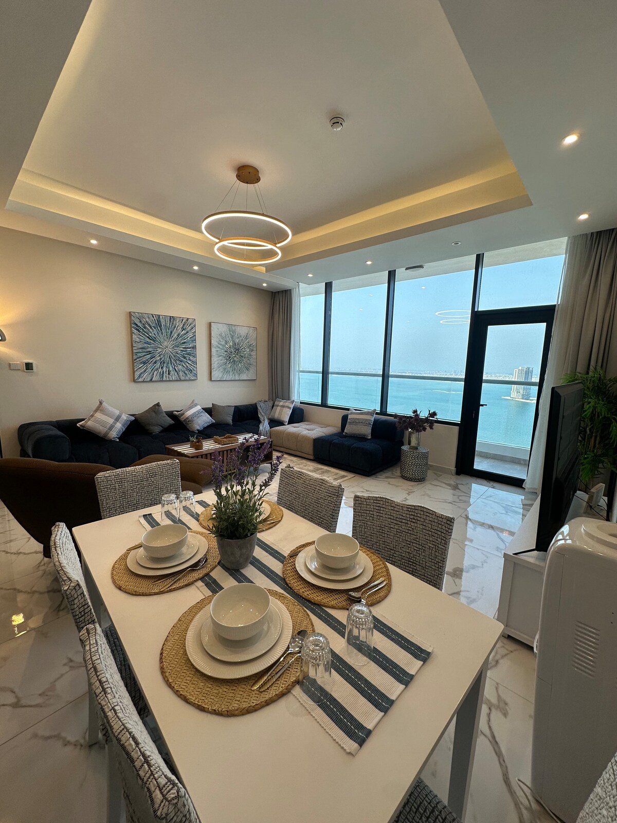 Find your inner peace and enjoy the most stunning view in this newly built apartment in Era View, Manama. This exquisite apartment #343 situated on the 34th floor, features a balcony(city/sea view), a cozy living room, bedroom with feather beddings, a fully equipped kitchen, dining area, toilet with free toiletries, two Smart 55-inches TVs (Netflix/Amazon Prime available), and high-speed internet access ideal for work and personal use.