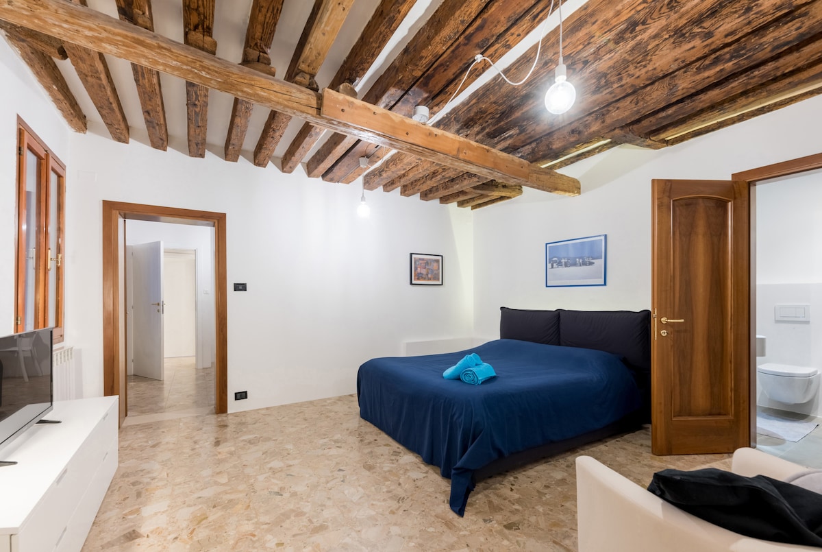 Espacio bastante fascinante, debido a una reforma de buen gusto, donde cada detalle ha sido cuidadosamente diseñado. Se encuentra en el segundo piso, bajo las vigas del techo, de un pequeño edificio situado justo detrás de la calle principal «Strada nuova». Luminoso, confortable, acogedor y tranquilo. Tiene ventanas en 2 lados y tiene vistas a los tejados, un canal y una zona abierta. A 1 minuto a pie hay 2 supermercados, muchas tiendas de comida, restaurantes, pizzerías, bares de vinos… no podrías esperar más. Dos paradas de autobús acuático están a 2/5 minutos a pie.