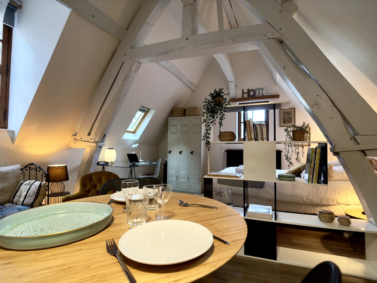 ¡Dúplex situado en el centro, en el barrio del Palacio de Justicia, en el último piso con vigas a la vista, acogedor y cómodo! Se encuentra en una calle peatonal tranquila y soleada. A menos de 10 minutos de la estación de tren, al pie de la rue du Gros Horloge. El apartamento está situado en el último piso de un edificio antiguo (sin ascensor). La habitación es dúplex. Alojamiento ecorresponsable con prácticas ecológicas: productos de limpieza ecológicos, contenedor de reciclaje, bolsa para hacer la compra...