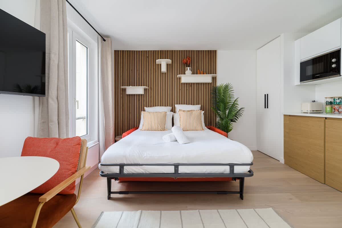 Alójate en este apartamento de un dormitorio de 45 metros cuadrados, elegantemente decorado y totalmente equipado, ubicado en el Boulevard du Temple en el corazón del vibrante distrito de Marais/Oberkampf. A solo unos pasos del distrito de Marais, este apartamento combina comodidad y estilo, proporcionando el entorno ideal para una estancia inolvidable para dos o hasta cuatro personas.
