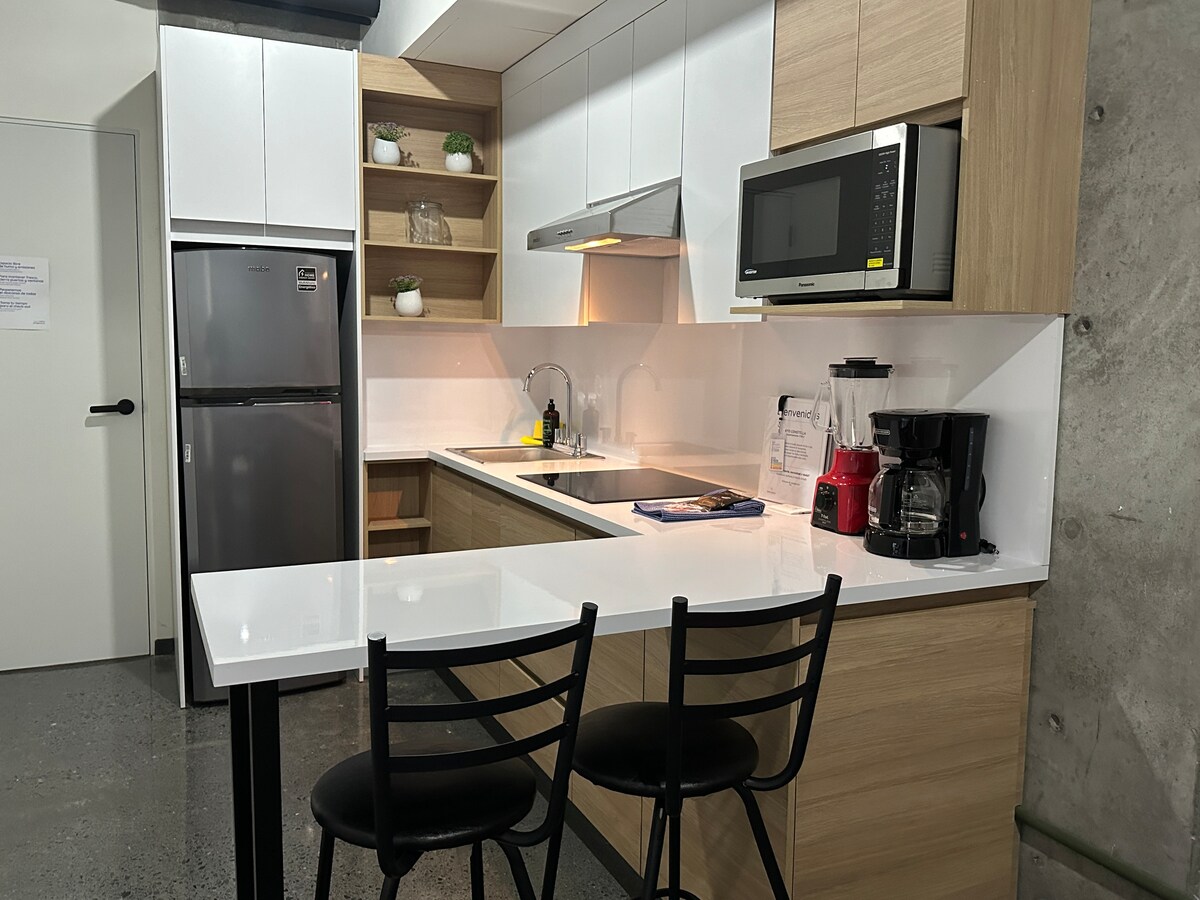Disfruta de la experiencia de alojarte en el corazón de Monterrey. Luminoso y cómodo apartamento tipo estudio con cama tamaño queen, sofá cama, wifi, TV de alta definición, baño y cocina totalmente equipada con nevera y todo lo que necesitas. Cerca del metro, el tren y calles importantes, estarás conectado con toda la ciudad en cuestión de minutos.