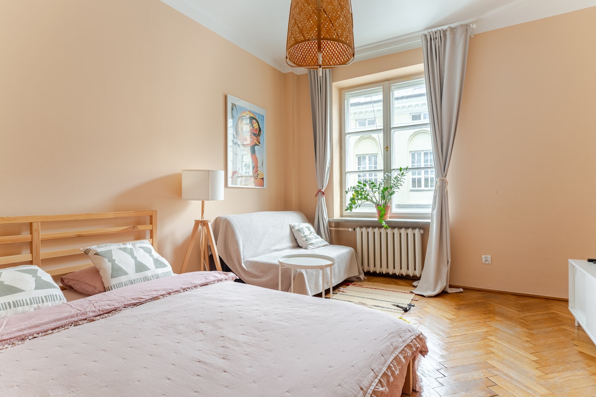 Un gran apartamento acogedor (80 metros cuadrados) justo en el centro de Varsovia con un gran espacio común (sala de estar y cocina) con una gran mesa de madera y un bonito balcón. 2 dormitorios pequeños, uno con una cama doble grande, uno con uno más pequeño. Perfecto para dos o tres personas, o para 2 parejas. A 5 minutos del metro, vista al Palacio de la Cultura.