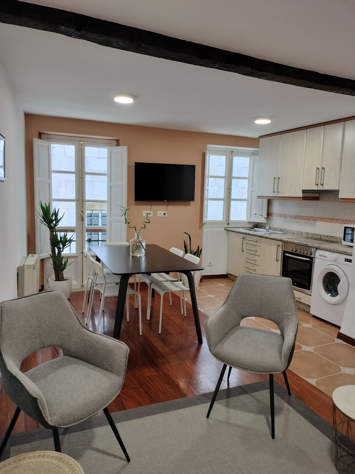Acogedor apartamento situado en una de las principales entradas a Santiago, con todos los servicios y a pocos minutos del centro. Espacio funcional con dormitorio con cama matrimonial separado por estantería de la zona de estar con sofá cama (sin puerta). Cocina totalmente equipada y baño completo con bañera. Ideal para familias con niños; para cuatro adultos el espacio puede resultar justo.