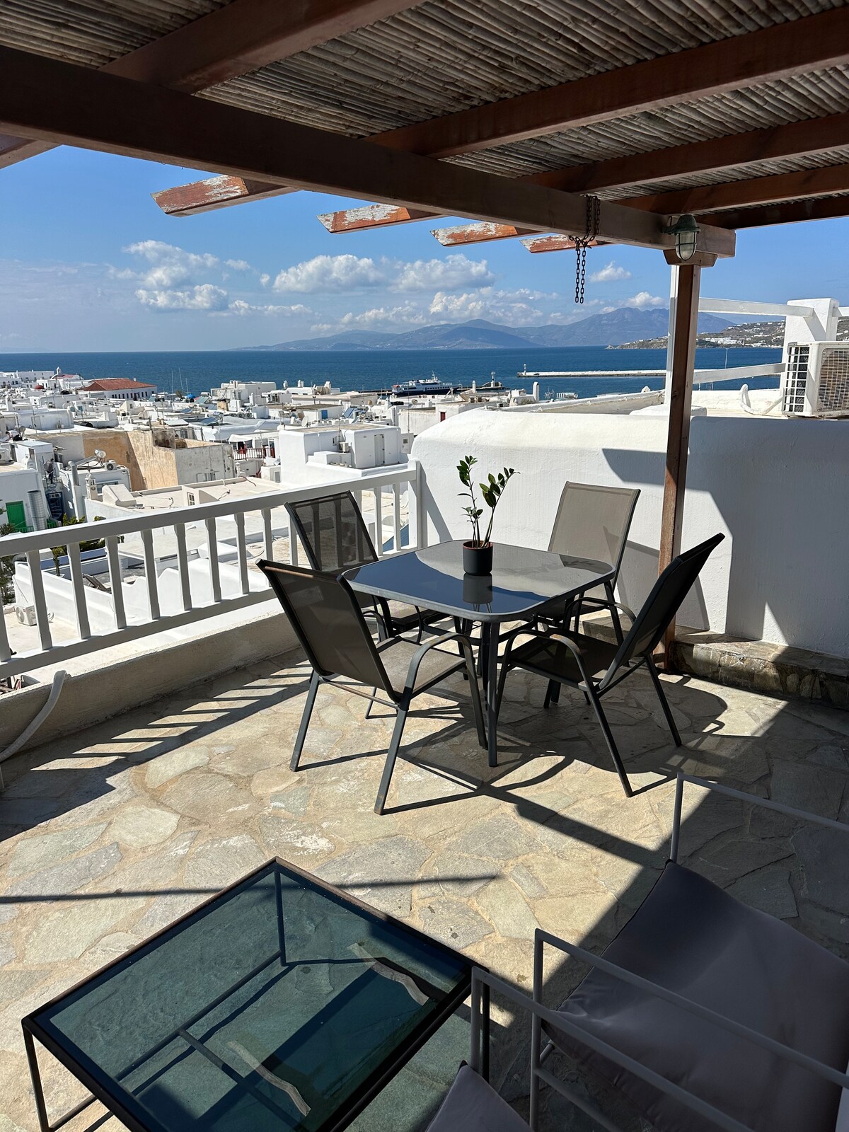 Welcome to a Unique & Pitoresque Myconian house, with great view at the Old Port! It s a unique opportunity to experience your mykonian trip from this apartment and it's amazing rooftop that is printed in all the famous mykonian sea front card postals!! Enjoy your special moments at the Heart of Mykonos Town, in a 35m square Roof Terrace with Unique view at the Old Port. Feel the Party all around you and Enjoy!