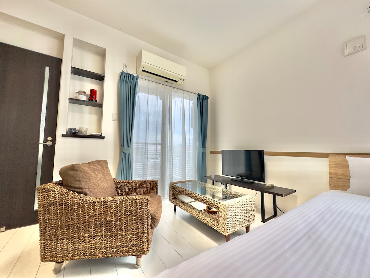 Espacioso tipo de habitación de 40ư 1LDK. ¡A solo 5 minutos a pie de la estación de Kencho-mae y de la calle Kokusai! ¡Tienda de conveniencia justo al lado del hotel y hay muchos restaurantes cerca! Puedes venir directamente del aeropuerto al hotel el primer día y alquilar un auto al día siguiente. Puede ahorrarte tiempo :) Está justo al lado de la parada de autobús interurbano, por lo que es una gran base para hacer turismo! Nuestro hotel no ofrece estacionamiento. Utilice el estacionamiento público de monedas.