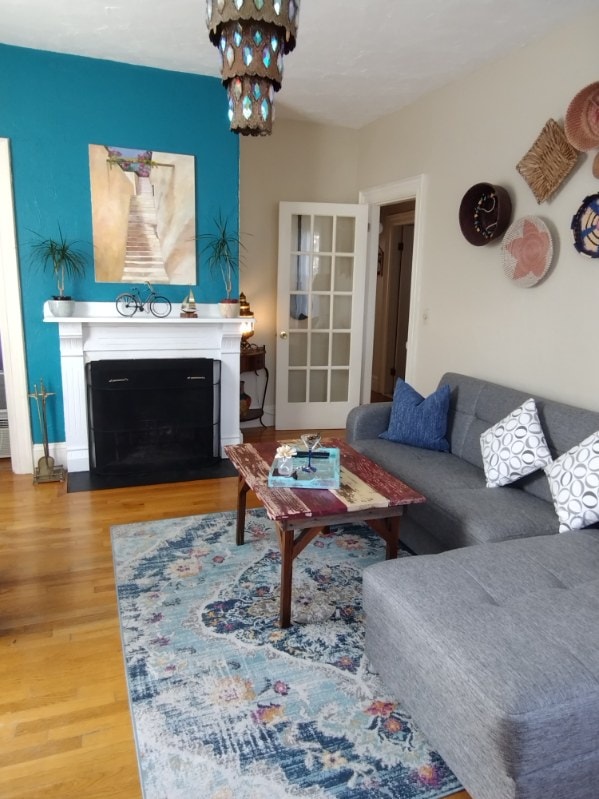 This was formerly a servant's quarters in a large colonial home on the third floor and accessed by a private stairway that leads from the first floor to the third floor. The living room and bedroom are both large with original wood floors and are appointed with a comfortable couch, chairs, full-sized bed, books, wall decorations, a big flat screen TV, private bathroom with tub and shower with all newer fixtures and there is also a small refrigerator and micro-wave. It is a totally private space.