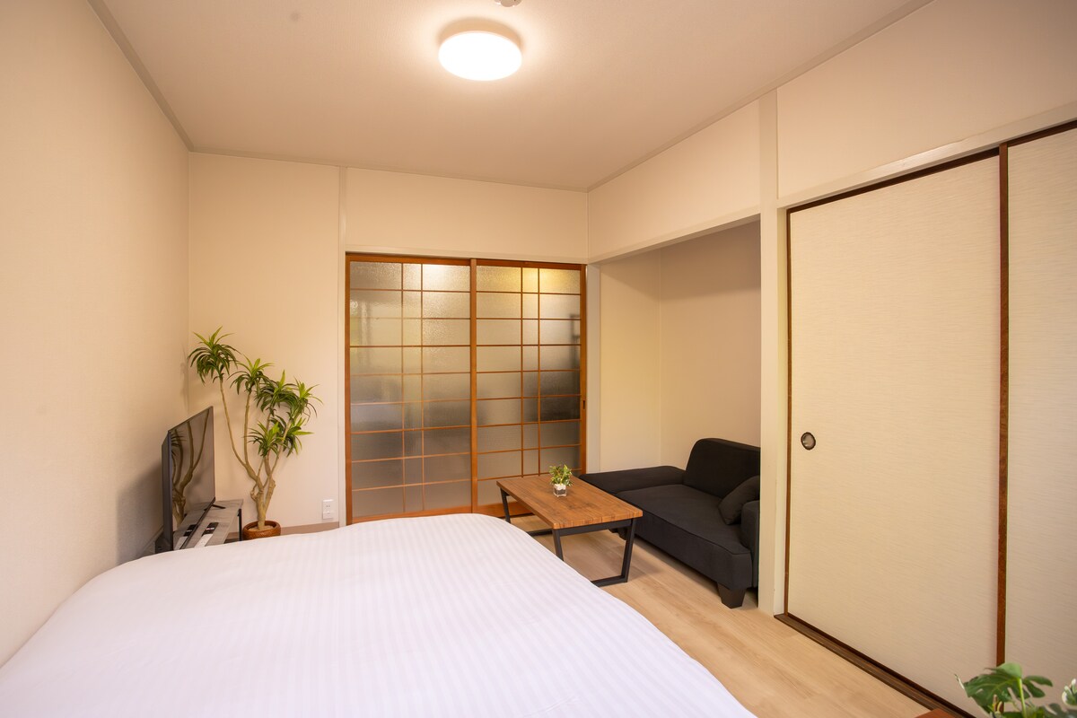 Es una ubicación estupenda en el corazón de Hiroshima, a solo 7 minutos a pie del Parque de la Paz. Es un lugar ideal para relajarse después de un día de turismo en Hiroshima. La entrada tiene cerradura automática por seguridad. Apartamento de 2 dormitorios ・Dormitorio 2: 2 camas dobles. ・Un sofá cama doble ・cocina ・aseo ・baño * Hay ropa de cama adicional disponible para el sofá cama. * Utiliza la ropa de cama de repuesto por tu cuenta. Hasta 6 personas en total pueden alojarse en la habitación.
