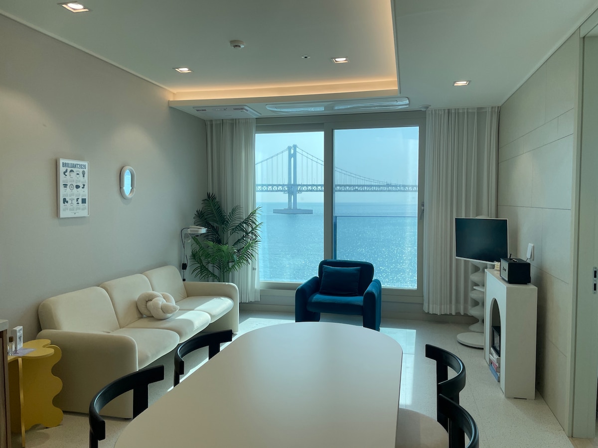 🌟숙소소개 ▪️초근접 광안대교를 볼 수 있는 환상적인 브릿지뷰입니다🌉💓 ▪️자체방역 실시하며 청결을 최우선적으로 합니다🧹😷 ▪️창밖으로 펼쳐진 힐링 오션뷰를 즐겨보세요🌊🍀 ▪️연인, 친구, 가족 모두 편안하게 지내실 수 있습니다(👫~👭👬) * 기본세팅 2인(최대 6인 가능) * 추가 침구류 3인 이상시 제공 * 침실2는 3인이상 예약 시 오픈됩니다. (**2인 예약시 침실1만 사용 가능하시고, 침실2 사용 불가하니 예약 시 착오없으시길 비랍니다. 유아는 카운팅 인원에서 제외됩니다**) ▪️생필품 구비 완료🧴🪥🧼 ▪️얼리체크인 불가합니다🥲 ▪️레이트 체크아웃 유료입니다(문의주세요☺️) ▪️숙소건물 자주식 무료주차장 이용가능 ❣숙소이용 포인트❣ ▪️반짝이는 윤슬✨을 바라보며 해돋이를 감상해 보아요🌅 ▪️매일밤 요트에서 터트리는 불꽃놀이를 즐길 수 있습니다🎇 감각적인 인테리어를 자랑하는 숙소를 200% 즐겨보세요(●'◡'●)❤️ 🛎이용시간 🕒 체크인: 15시 🕚 체크아웃: 11시