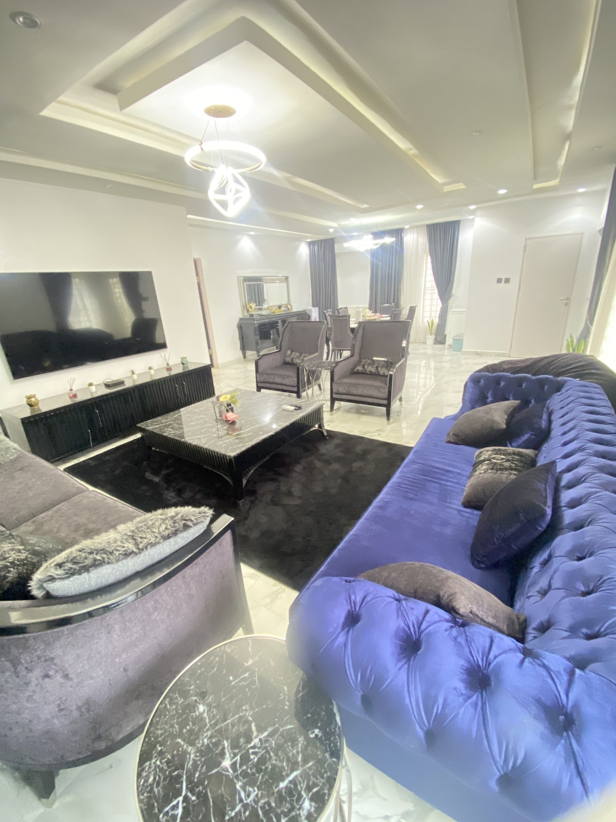 Disfruta de una experiencia elegante en este lugar céntrico. Un hogar lejos de casa, con una decoración de última generación y servicios para que disfrutes de una estancia inolvidable. Las instalaciones incluyen: -Play ! 5 - Wifi. - proximidad a lugares principales. A 2 minutos en auto de Maitama y a 5 minutos en auto de Wuse 2. - Electricidad las 24 horas con inversor y generador. - 2 balcones. -2 salas de estar - Televisores inteligentes en todas las habitaciones y salones.