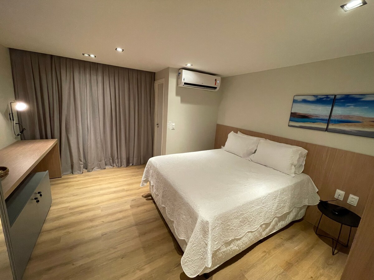 Studio novo e elegante em Ponta Negra, em prédio de alto padrão e design contemporâneo. Decoração moderna e acabamento refinado. Na melhor localização, a apenas 200 metros da praia e do restaurante Mangai, 100 metros do Camarões e a 1,5 km do Centro de Convenções. Inserido em um dos polos gastronômicos mais desejados da cidade, permite aproveitar bares e restaurantes a poucos passos. Ideal para casais, famílias, viagens a trabalho ou estadias especiais.