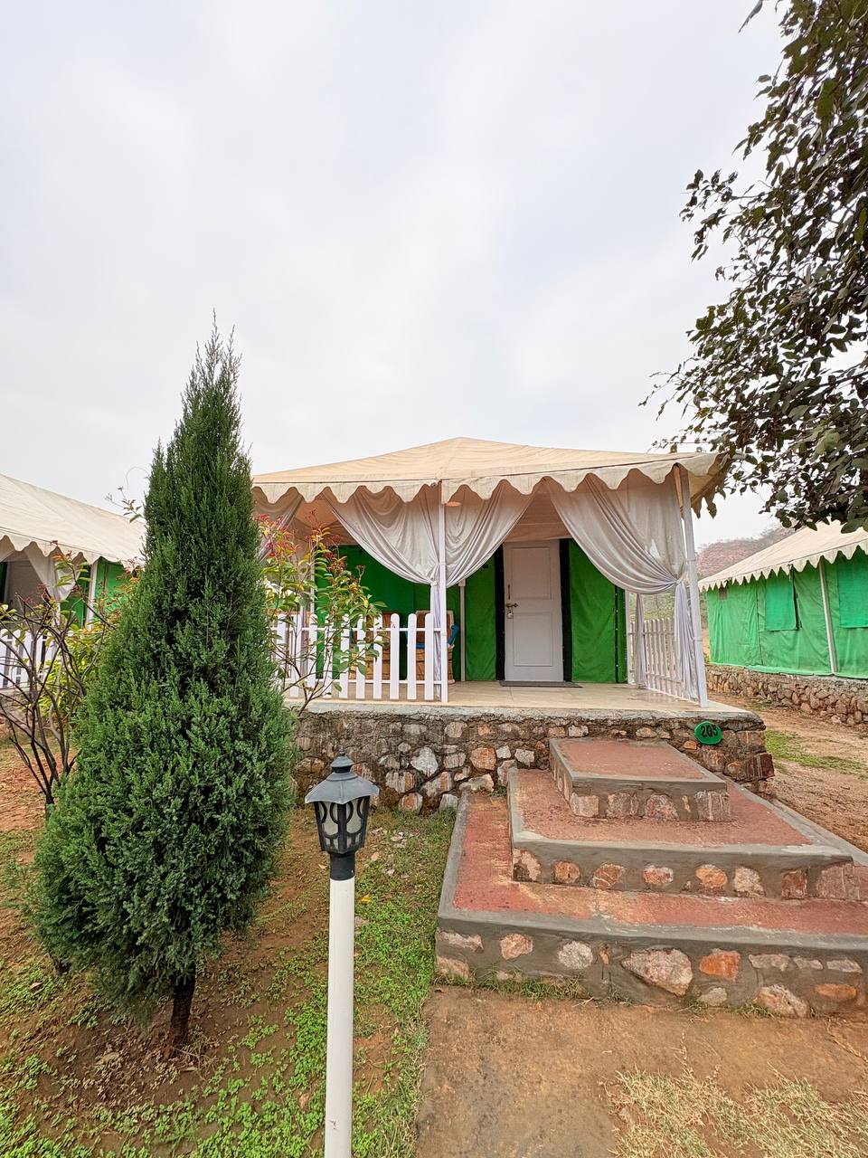 Nuestras lujosas tiendas de campaña enclavadas en medio de los paisajes serenos de la cordillera Aravalli ofrecen una armoniosa mezcla de comodidad y naturaleza. Entra en tu santuario privado con interiores espaciosos y bellamente decorados con una lujosa cama tamaño king, muebles elegantes y una decoración de buen gusto que refleja la artesanía local. El lujoso baño adjunto garantiza comodidad y sofisticación, con comodidades modernas y toques lujosos.