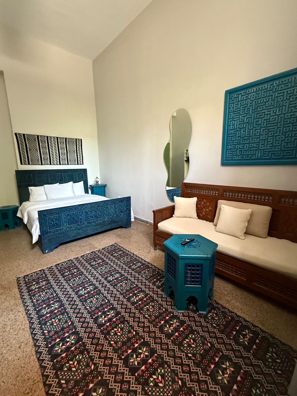 The Dome Chamber at Bayt Abbas Boutique Retreat is a private, standalone stay with a calm, earthy feel. It features a queen bed that fits two guests, a fully equipped kitchenette with a Nespresso capsules machine, toaster, microwave, electric stove, and kettle, plus a dressing room and a private bathroom. The retreat is 10 minutes from the Grand Egyptian Museum, 15 minutes from the Pyramids, 25 minutes from Downtown Cairo, 30 minutes from Sphinx Airport, and around 50 minutes from Cairo Airport.