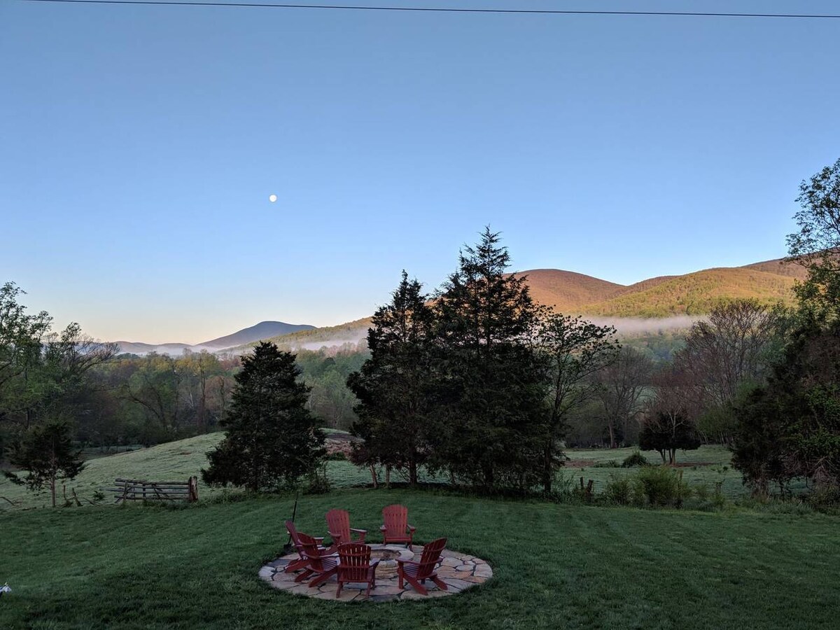 ¡Descubre por qué los huéspedes regresan año tras año! Escápate de la vida urbana en nuestra encantadora granja cerca de Wintergreen. Nuestra propiedad de 116 acres alberga cabras y patos amigables, y cuenta con magníficas vistas, una gran chimenea de piedra, jacuzzi, estanque para nadar y pescar, y cómodas habitaciones. Visita cervecerías o bodegas locales. Explora el aire libre o relájate en el porche. Disfruta de las alegrías de vivir en una granja con tus familiares y amigos.