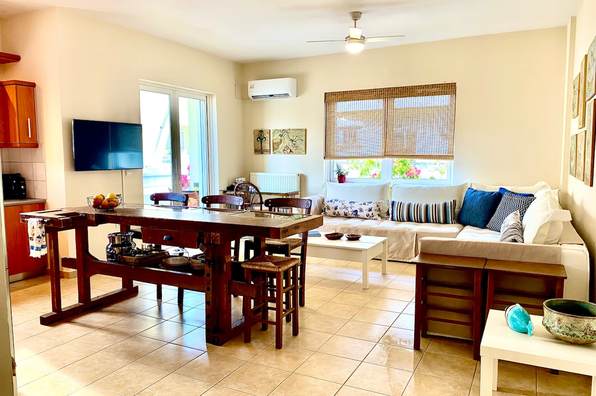 Nestled in a quiet area but both next to the beach and all amenities, this luxury brand-new apartment has unique setting that encapsulates Crete’s renowned beauty and combines the island hospitality with the comfort of modern facilities. The apartment is totally brand-new and can easily accommodate up to 4 guests. The nearest sandy beach of Vlites is less than 600m away. Minimarkets, Taverns, Cafe etc are also just a few minutes away from the apartment.