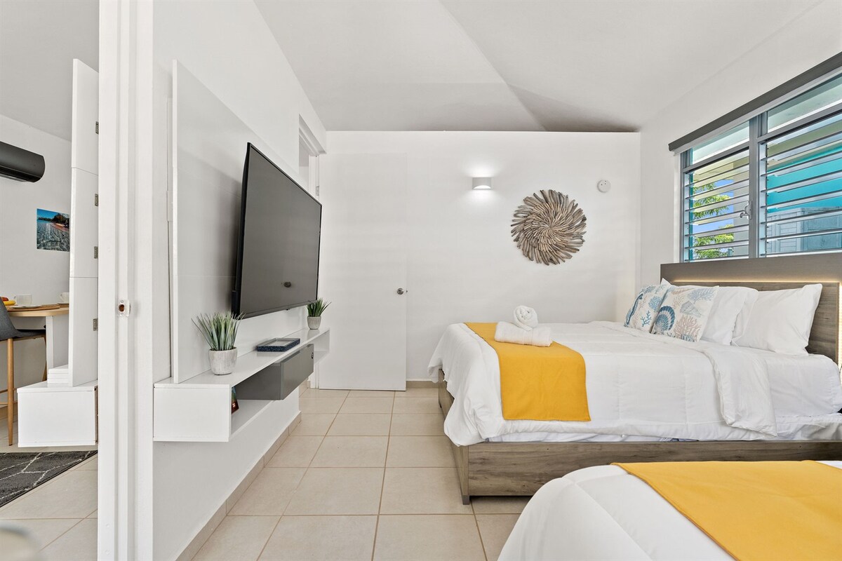 This island studio is in a secure gated community, centrally located, close to Christiansted. Perfect for single travelers & couples. Free WiFi & Smart TV. Comfortable queen size bed with ceiling fan. Nice sitting area & full size work desk. Dining table for 4. The kitchen is fully equipped: ceramic cook top, convection oven/microwave, fridge with freezer, toaster, coffee maker, blender, pots&pans, cooking utensils. Drinking water faucet.