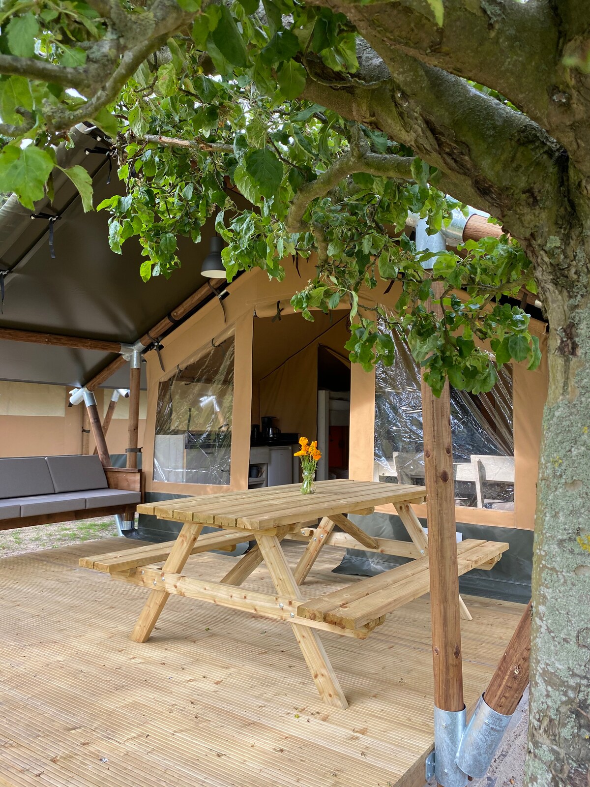 Nuestras tiendas de campaña de safari se encuentran en el borde del bosque, justo fuera del pueblo de West Terschelling. Tranquilo, afuera y céntrico a la isla. En bicicleta podrás explorar la isla. En los acogedores pueblos encontrarás acogedoras tiendas y restaurantes. La playa del Mar del Norte es vasta y más espaciosa de lo que estás acostumbrado desde otras playas holandesas. Es bueno saber que no hay fontanería y agua corriente en la tienda. Usted utiliza el edificio sanitario, que ha sido completamente renovado y equipado con todas las comodidades.