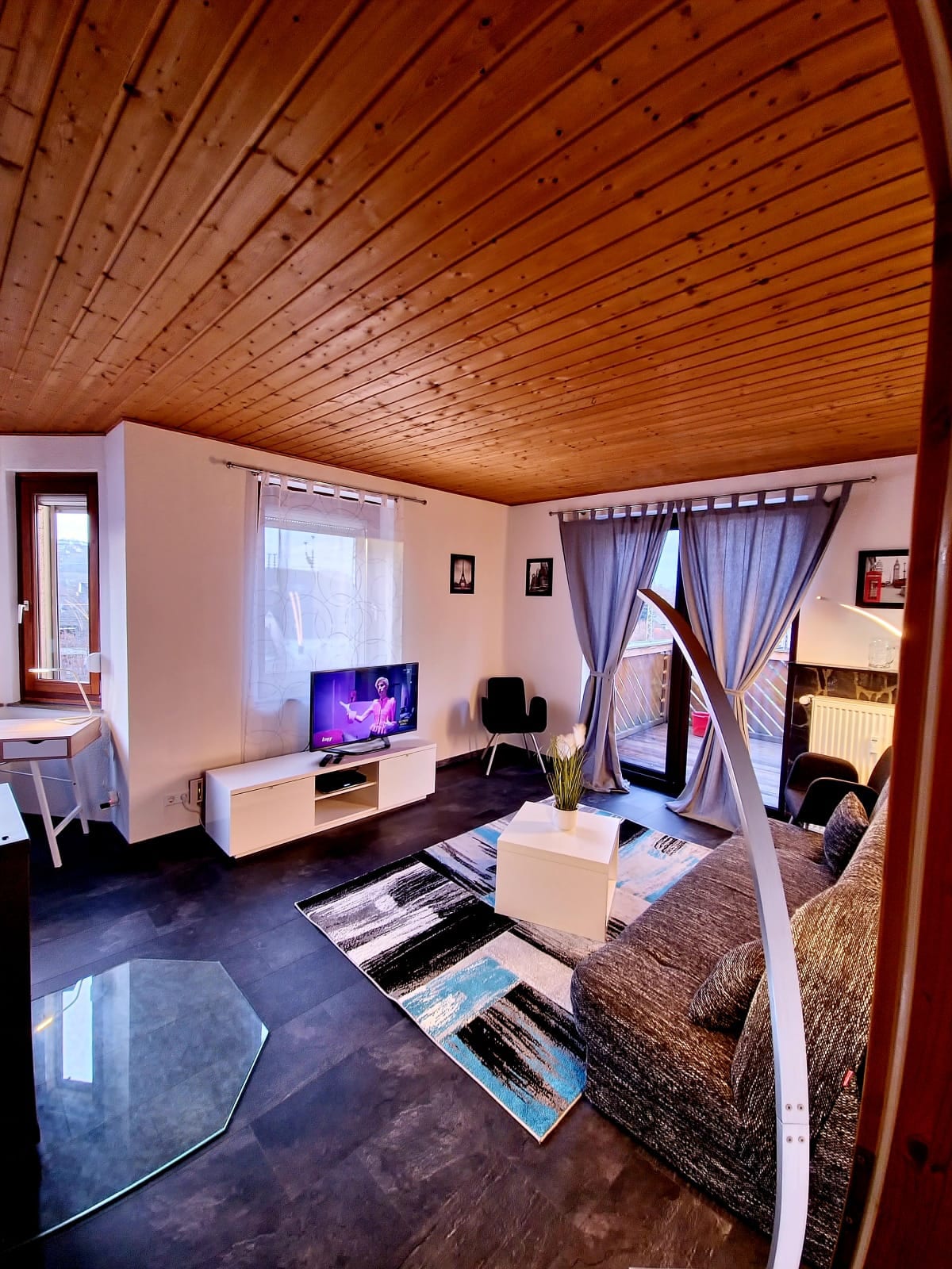 Traumhafte Dachwohnung (130 qm) im Herzen der Vulkaneifel, in Mehren/Daun. Idealer Standort für Wanderer/Radfahrer die Maare und den Eifelsteig zu entdecken, eine Oase zum Entspannen. Großzügiger Wohn-Essbereich führt in den herrlichen Wintergarten mit Kaminofen und auf die Terrasse mit bequemen Gartenmöbeln. Blick über Ort und Tal. Voll ausgestattete Küche. Beide Schlafzimmer mit Doppelbetten (160cm). Vom größeren Schlafzimmer Zugang zur Terrasse. Parken direkt am Haus. Kinder willkommen.