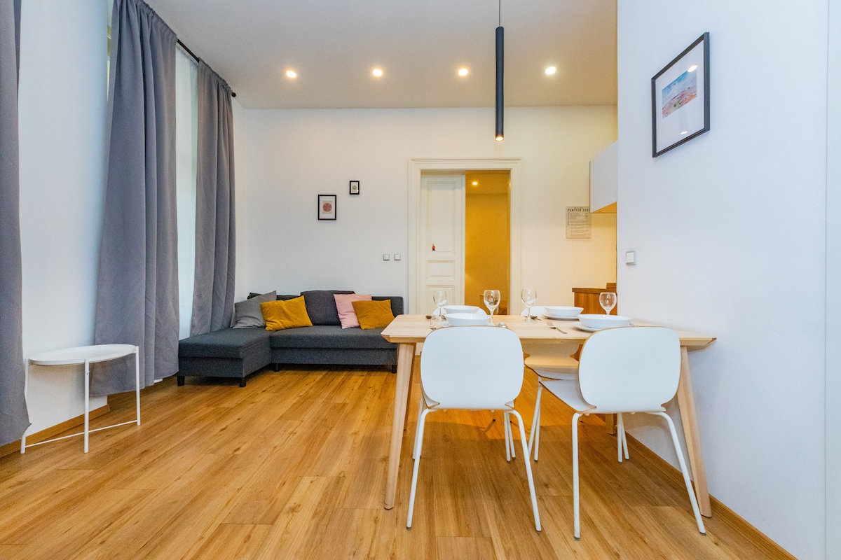 Finalista del concurso TOP Modern-Classic Design 2023. Alójate en el apartamento más elegante que hayas visto nunca. Nota: NO es un apartamento para FIESTAS. La mejor ubicación: - A 2 minutos del Museo Nacional y la plaza Wenceslao. - A 3 minutos de la estación principal de trenes. - A 1 minuto del parque Riegrovy sady, el más bonito. El equipamiento - Ver películas en calidad de cine en casa: pantalla gigante. - Relájate en la sauna infrarroja. El diseño - Elementos y muebles cuidadosamente seleccionados que subrayan el estilo histórico.
