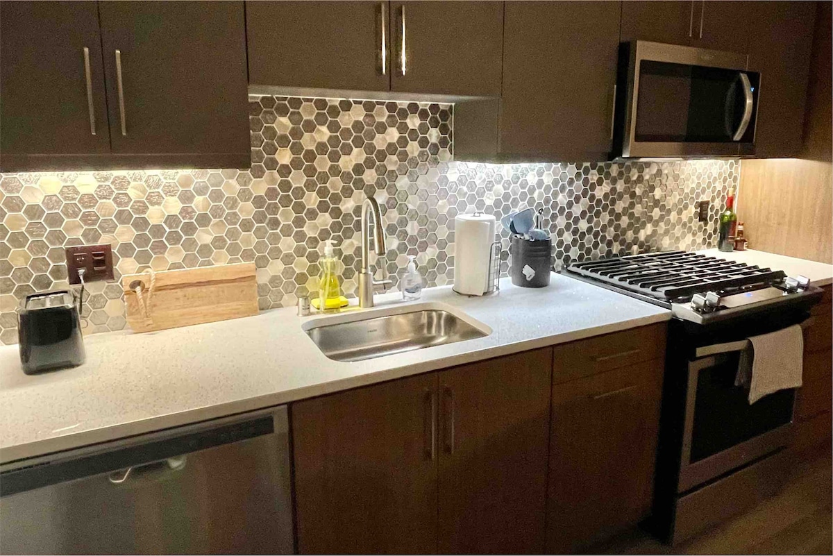 AMAZING 1 KiNG Bed 1 Full Bath apartment/condo. Approximately 780 square feet. A comfortable, firm kind size bed. Walk in closet. Sleeps 2 comfortably, sleeping in couch is optional. Living room - 65" Smart TV ( log-into your favorite programs). Large couch. Full kitchen, kitchen island, open concept with everything you need for a short or long stay. Double vanity, his/hers. Private deck. In unit Washer/Dryer. Ample space. Always Clean and ready on time.