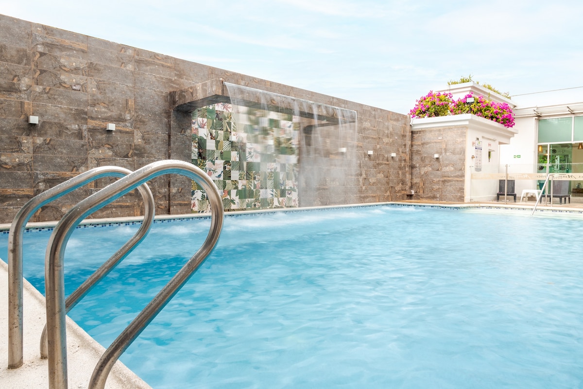 No querrás irte de este lugar tan único y encantador. Ubicado sobre la vía principal. Recepción y parqueadero 24/7; piscina, turco, restaurante, bar y zona de spa. Tu habitación cuenta con aire acondicionado, baño privado y televisión por cable. También tiene balcón con vista a las zonas verdes del hotel y a la piscina. Cerca del hotel podrás encontrar una tienda Oxxo, D1 y 2 supermercados. A 3 cuadras la zona de discotecas y bares. A 5 minutos la plazoleta central y la iglesia principal.
