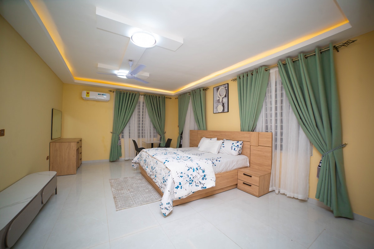 Relax in downy stairs apt. family members and friends at this peaceful 4 different unit villa . You will have 1 unit for your self unless you booked the whole Villa It’s equipped with CCTV cameras, electronic fence with alarm systems, burglar proofing on all windows and security doors at the doors Solar panels for energy, Starlink Internet and solar lamps on the compound. Closer to Tema, airport, Accra mall, Akosombo, Ada , Accra central, beaches etc Airport pickups and rentals