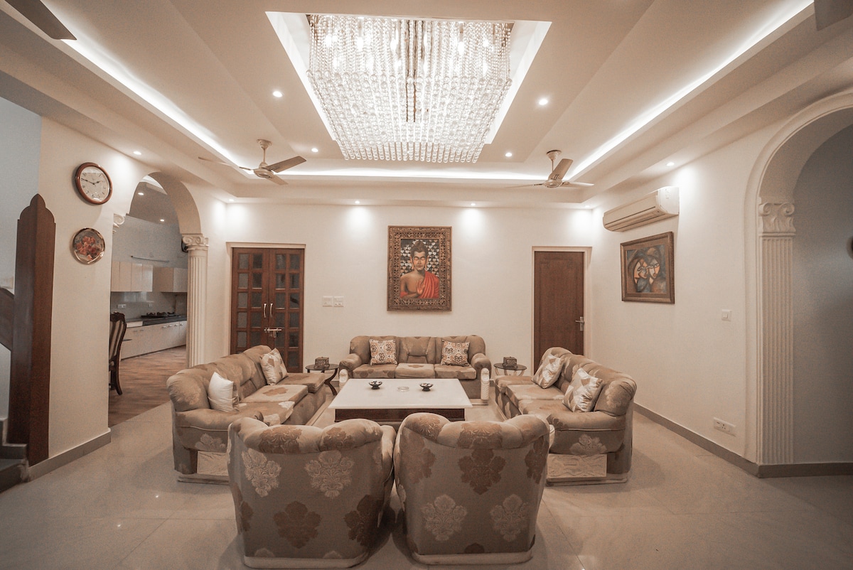 Permítenos hospedarte en nuestra espaciosa casa de huéspedes de 3 habitaciones con un gran comedor y un acogedor espacio verde para pasar la noche perfecta con los seres queridos. También tiene un chef las 24 horas (se aplican cargos mínimos de comida). La propiedad se puede reservar para eventos como bodas, fiestas de cumpleaños, fiestas de gatitos, etc. Está a solo 10 minutos de la estación de tren de Anand Vihar, a 30 minutos de la estación de tren de Nueva Delhi, a 30 minutos del aeropuerto IGI y a 10 minutos de la estación de metro de Vaishali.