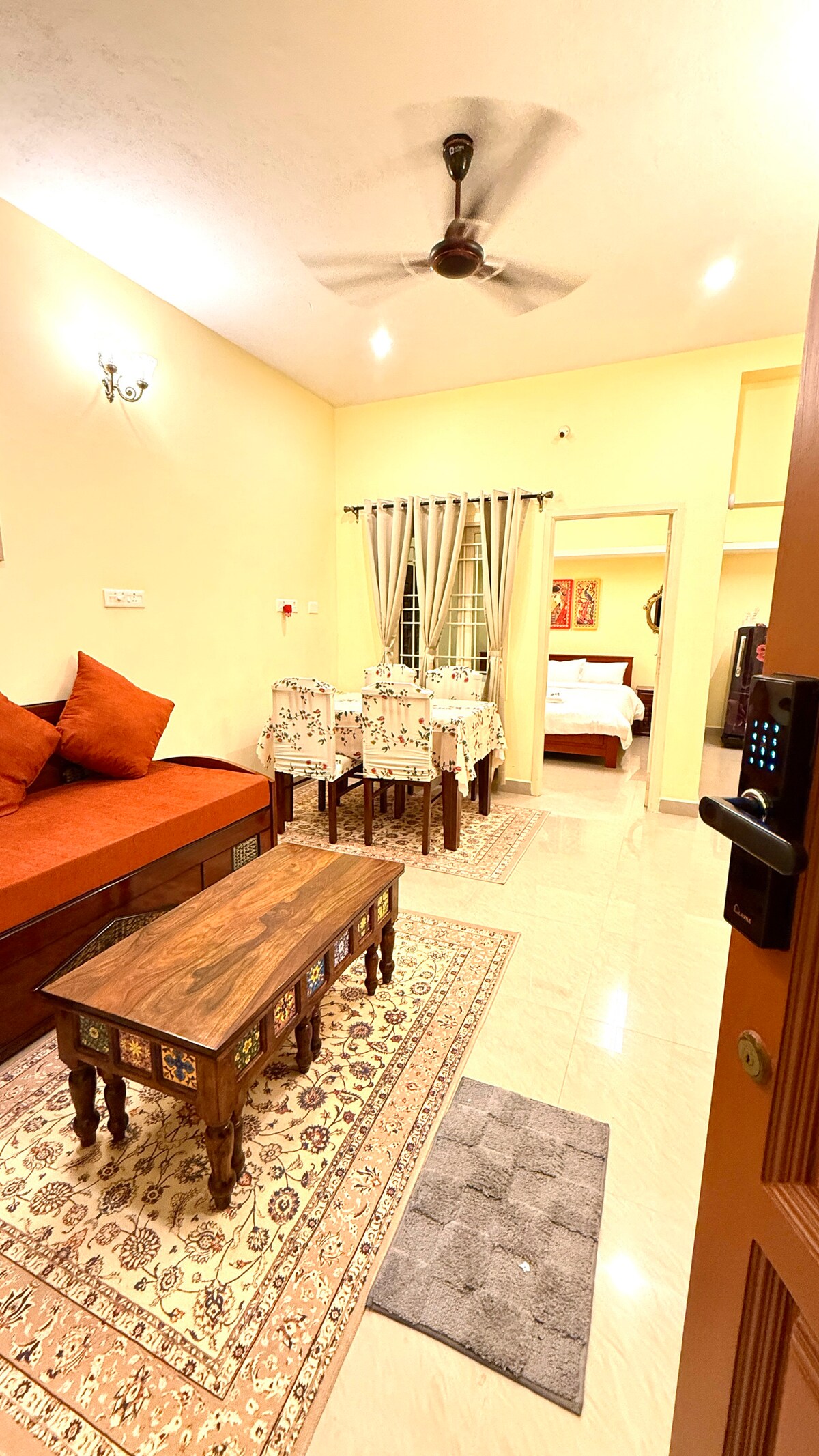 Your home away from home in Auroville has been tastefully decorated to a Chettinad theme. Every corner of our home is Instagramworthy with colourful interiors, kolam art, antique decor and more. The 1BHK can comfortably accommodate up to 4 persons with a swing bed and sofa bed in the living room. hile there are plenty of restaurants nearby, our kitchen has been thoughtfully equipped for all your needs - be it to make a quick omelette or a full Indian meal. So sit back, relax and sip your coffee.