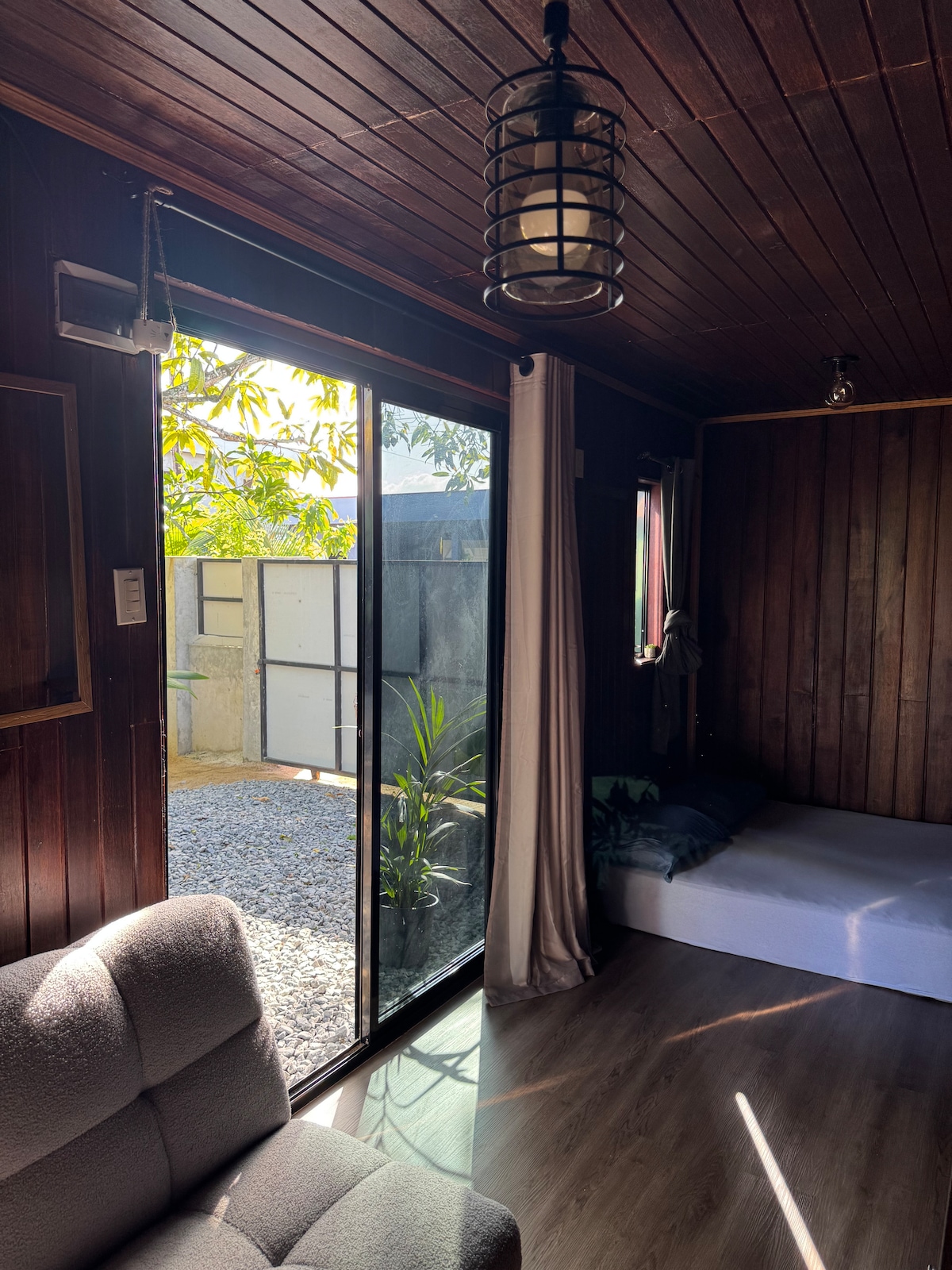 Este albergue de madera se encuentra a menudo en el interior profundo de Surinam, la diferencia es que este albergue está equipado con luces, electricidad, hervidor de agua, nevera y wifi. El baño está completamente revestido de azulejos. Hay un amplio armario abierto para ropa y equipaje y, por supuesto, un balcón para la hamaca. Las ventanas de las mosquiteras se extienden alrededor de todo el albergue, dejando entrar el viento y una cacofonía de sonidos de pájaros.