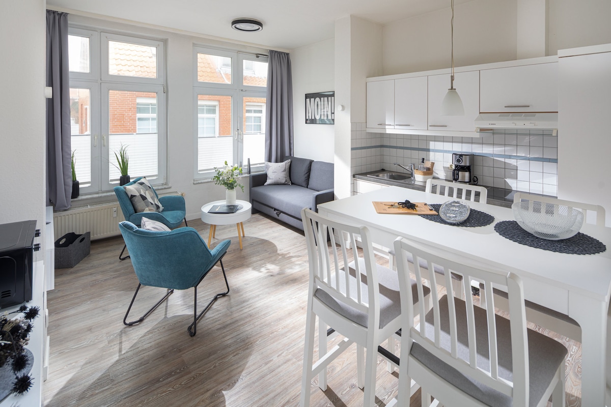 3*** DTV-Klassifizierung. Die lichtdurchflutete 2 Raum Ferienwohnung Möwennest by DeJu in Norderney ist ca. 40 qm groß und liegt direkt am Weststrand. Sie zeichnet sich durch eine sehr zentrale Lage aus. Bis zum Strand oder zum Kurplatz mit dem angrenzenden Badehaus sind es 200 m. Bis 4 Personen geeignet und buchbar (bitte Hinweis dazu beachten). Die Wohnung wurde Anfang 2024 vollumfänglich renoviert.
