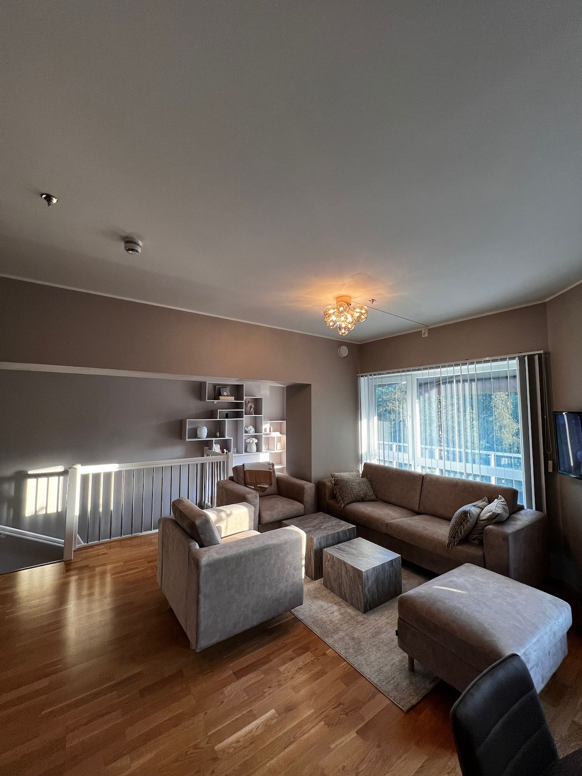 Leilighet med høy standard, romslig terrasse med sofa og spiseplass, takvifte på soverom, «waterfall» - dusj, vaskemaskin og tørketrommel. Fire minutter til bussholdeplass. Sengen er 140 cm, så skal man være 2 bør man være et par eller veldig så gode venner :) Mulig å leie parkering. Anbefaler å laste ned Aimo Park appen på forhånd, da den kan være vanskelig å laste ned via 5G nettet. Leiligheten ligger ikke «nær innsjø», men har foreløpig ikke greid å fjerne det fra AirBnB.