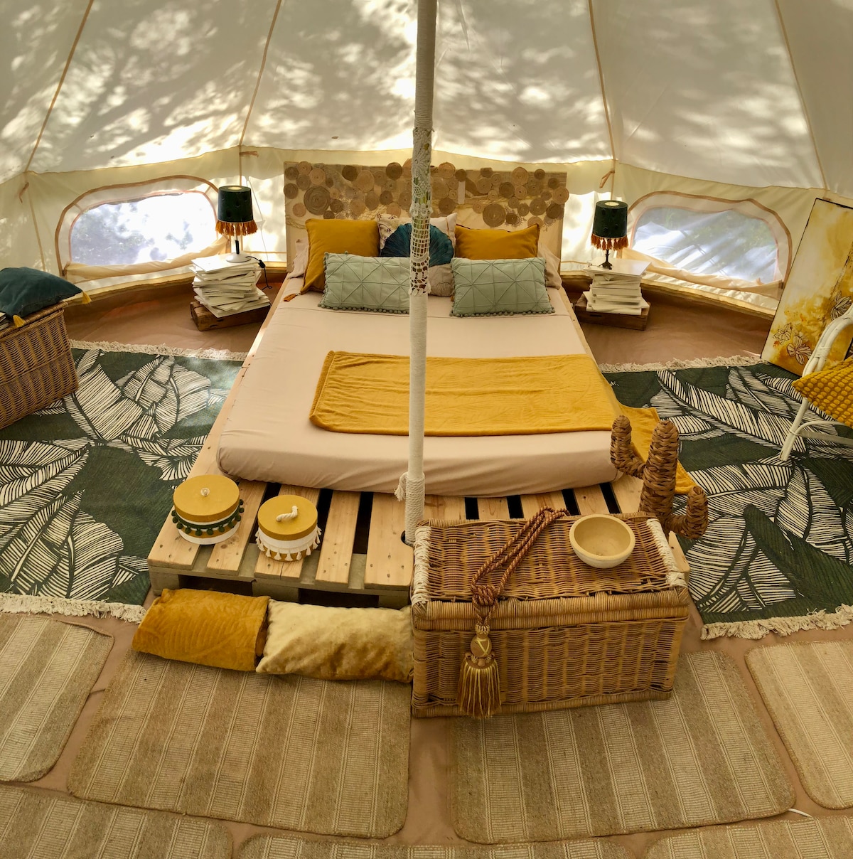 Acogedora Bell Tent, pensada para quienes valoran la tranquilidad y los pequeños detalles. Perfecta para 2 o 3 personas, con cama doble, cama individual y espacio suficiente para descansar cómodamente. Forma parte de un espacio ecológico rodeado de árboles, donde la desconexión está garantizada. En el exterior podrás disfrutar de una zona íntima y privada, donde podrás descansar, tomar un picnic o simplemente relajarte. Baños compartidos y un ambiente pensado para disfrutar sin prisas.