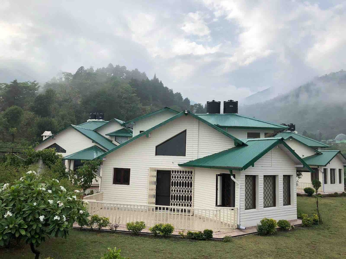 * Casa de campo de lujo de 3 dormitorios y 2 baños * Situado en la cima de una colina con las mejores vistas a la nieve del Himalaya y vistas al bosque de la región. * Numerosos espacios de trabajo en la casa y al aire libre * Césped alrededor de la cabaña con amplio espacio * Cocina totalmente equipada con todos los electrodomésticos * Wifi, estacionamiento, TV inteligente, juegos de mesa * Pisos pintorescos de la bahía, barbacoa y chimenea, tumbonas para descansar, opciones gastronómicas al aire libre * Cuidador in situ